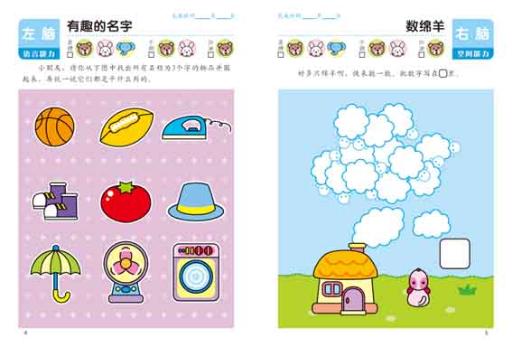 左脑右脑对对碰系列丛书分为1~2岁、2~3岁、3~4岁、4~5岁、5~6岁、6~7岁六个分册,根据难易程度的不同而划分,不同年龄段的孩子都有对应的练习,有较强的阶梯性。书中包括左脑开发的数理能力、语言能力等,右脑开发的空间知觉能力、图形认知能力等,以及左右脑对对碰的游戏,如:対页棋等。书中内容丰富,语言简洁,题型新颖,图画自然大方能让孩子在玩耍中得到智力的开发,思维的锻炼。