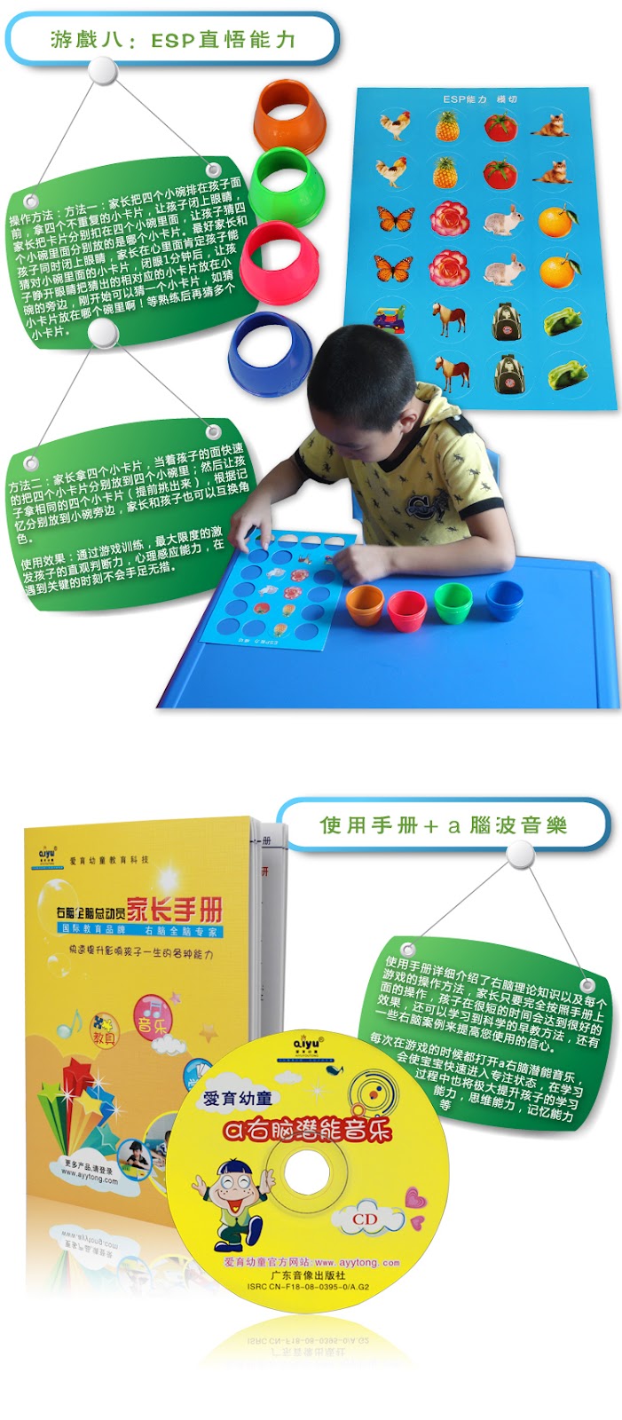 爱育幼童——七田式儿童右脑全脑总动员,分九大操作方法及功效,快速提升孩童的专注力、记忆力、创新能力、思维能力、观察能力、照相记忆能力、联想能力、空间记忆能力、观察记忆能力。孩童在游戏过程中,能始终处于专注状态。他们经过手的操做感知、经过眼的双径配合,快速的将资讯传输到右脑潜意识当中,右脑经过不同程度的刺激,积累的大量信息会促进左脑的逻辑分析能力的成熟,从而达到右脑全脑平衡处理资讯的目的。